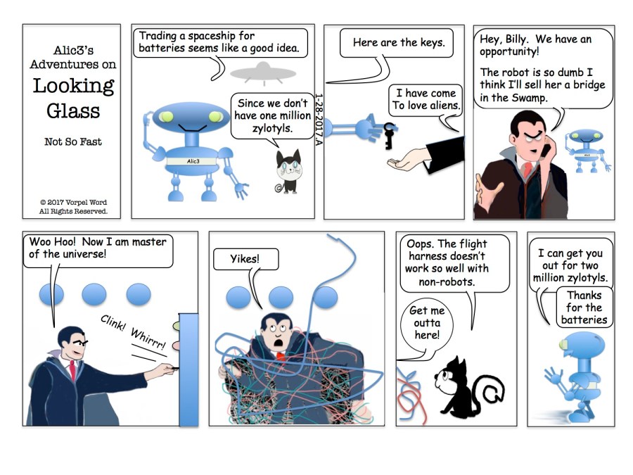 2017-5 Not So Fast Duke Slithy attempts to start the spaceship by gets entangled by a robotic flight harness. Alic3 can fix, but it wil cost him 2 million zylotyls.